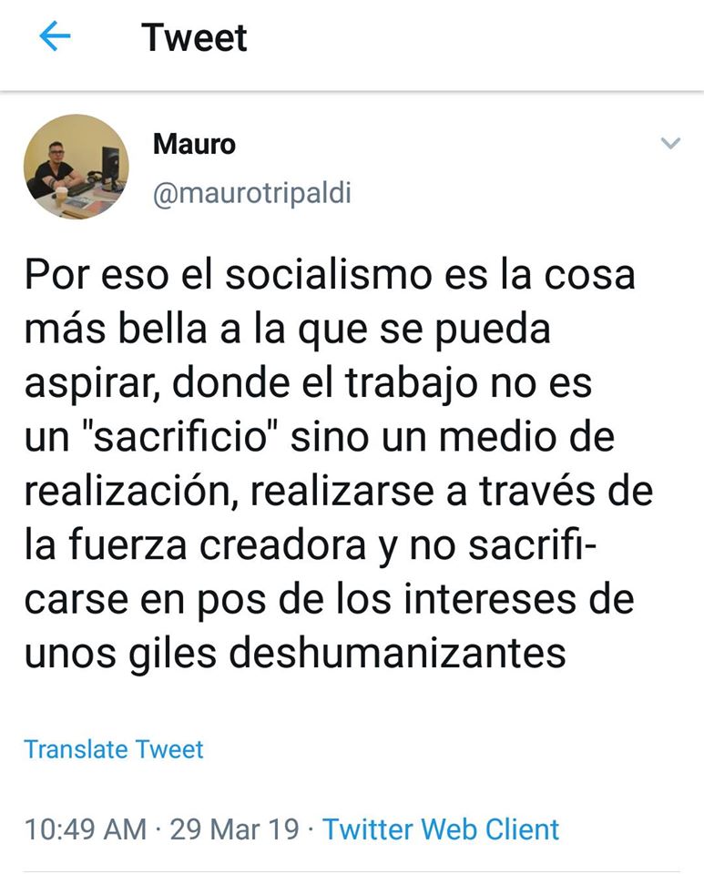 Pero él sabe que hay otro socialismo, el real y diferente al de las historietas infantiles, el que por 100 años se ha estado probando en cientos de países y siempre con las mismas nefastas consecuencias. Pero Mauro mataría con tal de evitar que alguien le hable de ese socialismo, él prefiere que ese socialismo real sea disfrutado por otros mientras él sigue sufriendo dentro de su odiado capitalismo en una heroica e incansable lucha para vencerlo en la forma más contundente y demoledora: consumiendo lo más posible sus productos y servicios y así llevarlo rápidamente a la bancarrota.